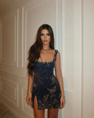 Dare to shine in the IBIZA | Midnight Dress, designed for those who thrive under the city lights and moonlit skies. This show-stopping piece features an intricate celestial-inspired design, shimmering against a deep midnight blue backdrop for a look that’s both bold and elegant.